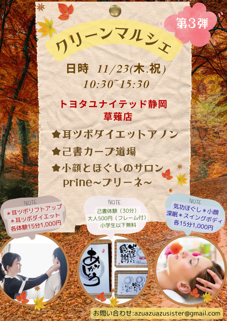 お子さまも一緒に楽しめる己書のワークショップと、きれいに痩せたい方への耳ツボ体験、お手軽にリフレッシュできる施術をゆったりとお楽しみいただける3店舗の小さなマルシェです🎵