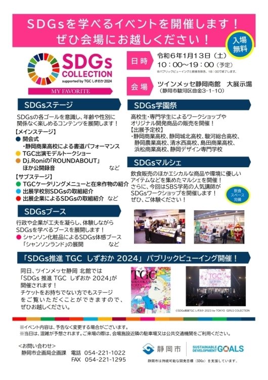 メインステージでは、静岡県立静岡商業高校書道部による書道パフォーマンス、TGC出演モデルによるトークショー、SBSラジオの公開録音のほか、14時からツインメッセ静岡北館で開催される「SDGs 推進 TGC しずおか 2024」のパブリックビューイングを開催します!