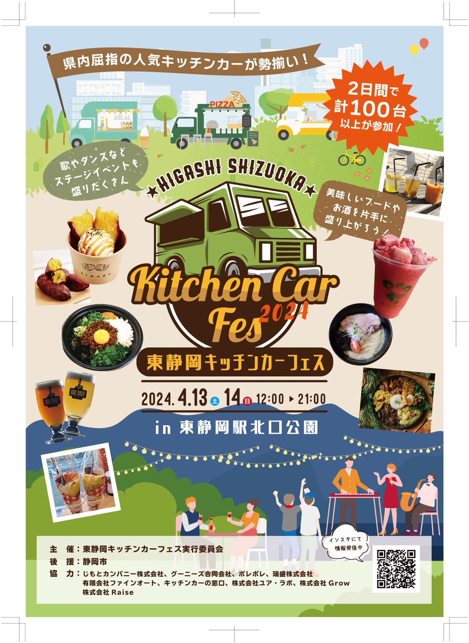 第一回の沼津キッチンカーフェスでは1万人以上の来場者で大変盛り上がったイベントが ついに東静岡キッチンカーフェスとして2024年4月に開催決定ました。 場所はJR東静岡駅北口から徒歩10秒の「東静岡駅前北口広場」となります。 静岡県内の人気のキッチンカーが勢ぞろいします。 「東静岡キッチンカーフェス」は、県内の人気キッチンカー二日で100台集合するイベントです。 音楽やダンスもあり、テントサイトでは県内各地の名物、体験ブースが出店します。 予想来場者数は2万人