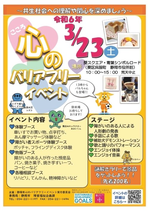| お問い合わせ | 静岡市心のバリアフリーイベント実行委員会(静岡市障害福祉企画課) 電話番号:054-221-1197 ファクス:054-221-1494 |