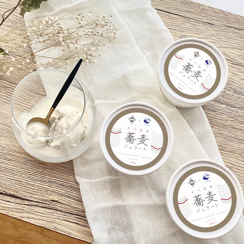 ② 新発売✨ ˹ 大川在来蕎麦ジェラート ˼ 大川地区で100年続く大川在来蕎麦を使用したジェラートです 🍨 「大川小中学校」の生徒さんと共同開発したジェラートをお茶まつりより新発売いたします✨