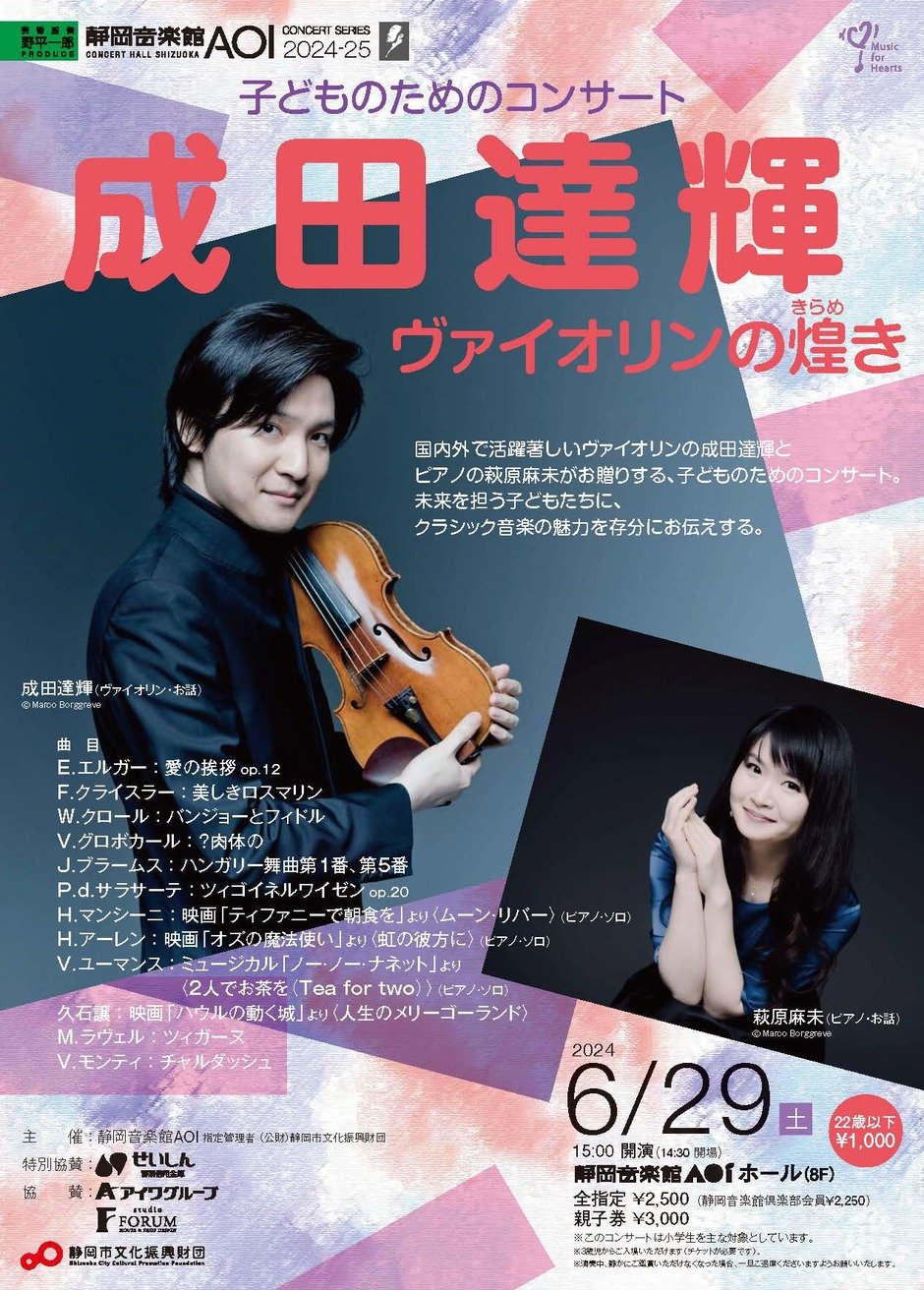| 参加費 | 全指定\2,500(静岡音楽館倶楽部会員\2,250、22歳以下\1,000)親子券\3,000 |