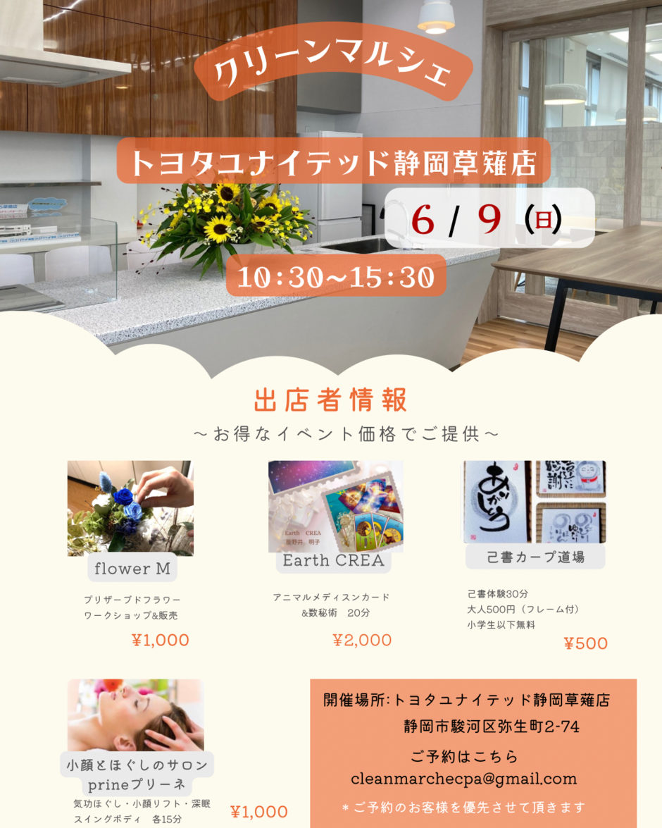 トヨタユナイテッド静岡草薙店さんにてクリーンマルシェを開催します。 今回もTVで取り上げられた庵原にある人気お惣菜店【三代目つきや】さんのお惣菜も販売します。売り切れ御免‼️大人気の「めちゃウマさといも揚げ」「バスクチーズケーキ」「マフィン」などのスイーツも販売✨ 試食もご用意しておりますので、お気軽にお試し下さい♬.*゚ リラクゼーション、占い、ブリザーブドフラワーワークショップ、己書体験が出来ます。 お近くのお客様、お時間のあるお客様、ご家族お友達お誘いの上お気軽にお越しください。お待ちしております🍀