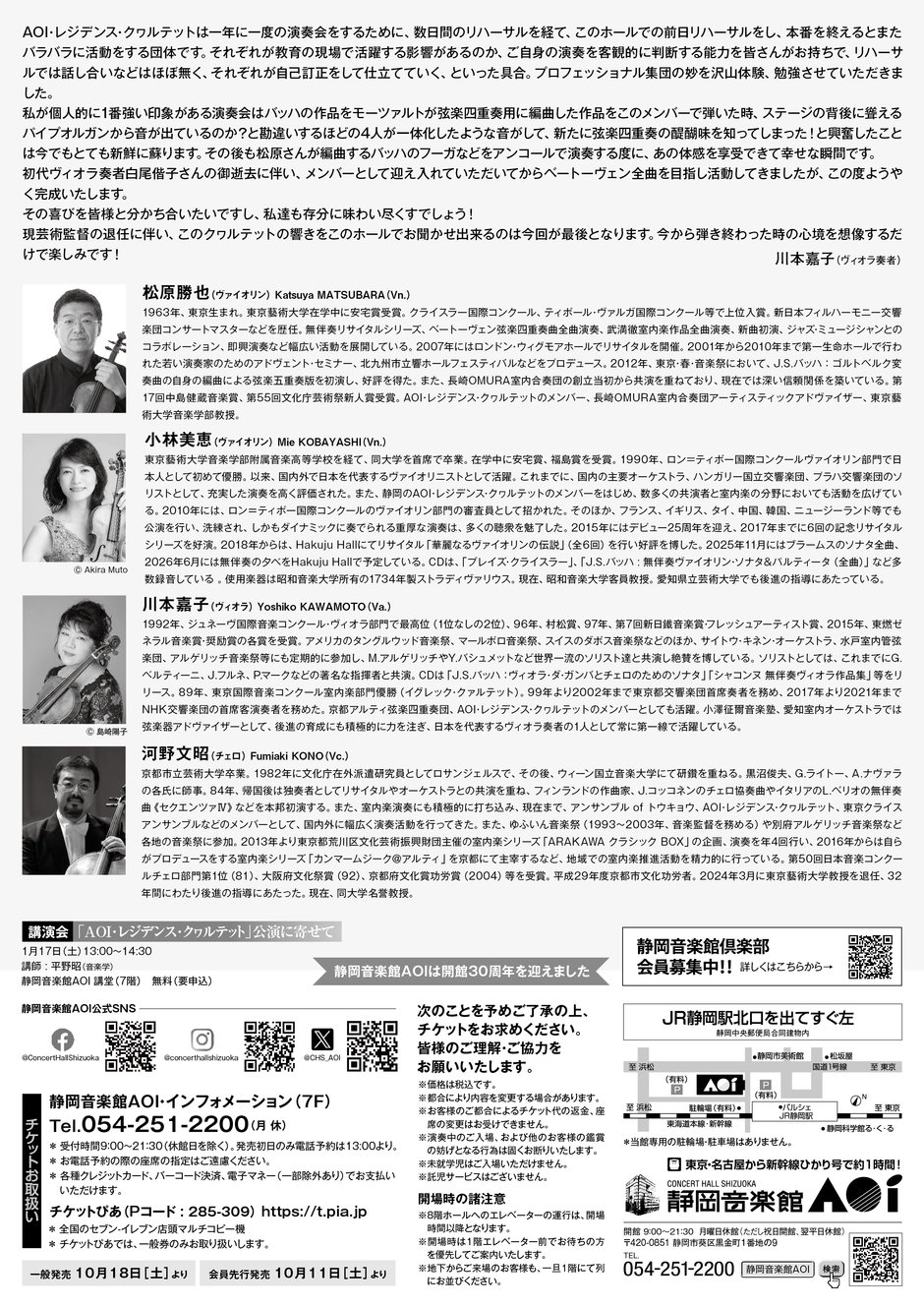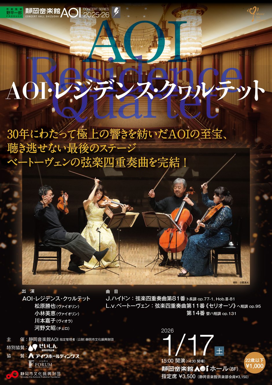 1995年の開館以来、AOIの専属弦楽四重奏団として活動を続けてきたAOI・レジデンス・クヮルテット。室内楽の真髄を追い、数々の名演を重ねてきた彼らが、ついに専属楽団として最後の舞台を迎える。長年取り組んできたベートーヴェン弦楽四重奏曲全曲演奏シリーズの最終章。弦楽四重奏の頂点に挑む、渾身の集大成。 主催:静岡音楽館AOI 指定管理者(公財)静岡市文化振興財団 申込方法:静岡音楽館AOI窓口か電話にて 備考: ・未就学児はご入場いただけません。 ・都合により内容を変更する場合があります。