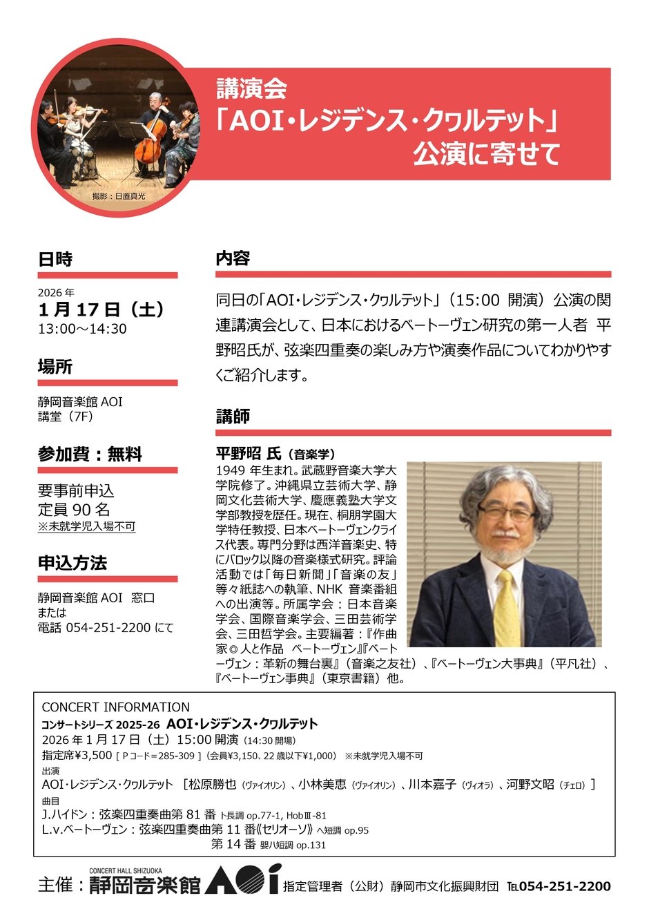 静岡音楽館AOIでは、作曲家や作品に焦点をあてた無料講演会を開催します。聴けばコンサートが何倍も楽しめます。今回の講演会は、同日15:00よりホールで開催する「AOI・レジデンス・クヮルテット」公演に関連し、日本のベートーヴェン研究第一人者・平野昭氏が弦楽四重奏の魅力や演奏作品をわかりやすく解説します。 主催:静岡音楽館AOI 指定管理者(公財)静岡市文化振興財団 申込方法:静岡音楽館AOI窓口か電話にて 備考: ・未就学児はご入場いただけません。 ・都合により内容を変更する場合があります。