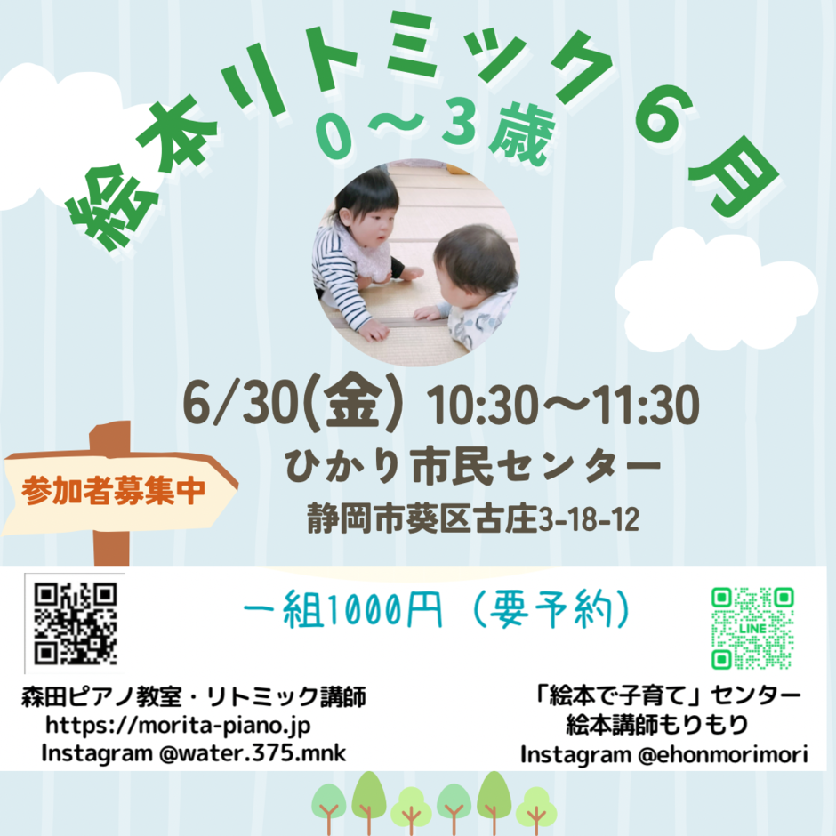 0歳〜3歳 絵本リトミック ピアノ&リトミック講師の森田先生とNPO法人絵本で子育てセンター絵本講師もりもりによる「絵本リトミック」。