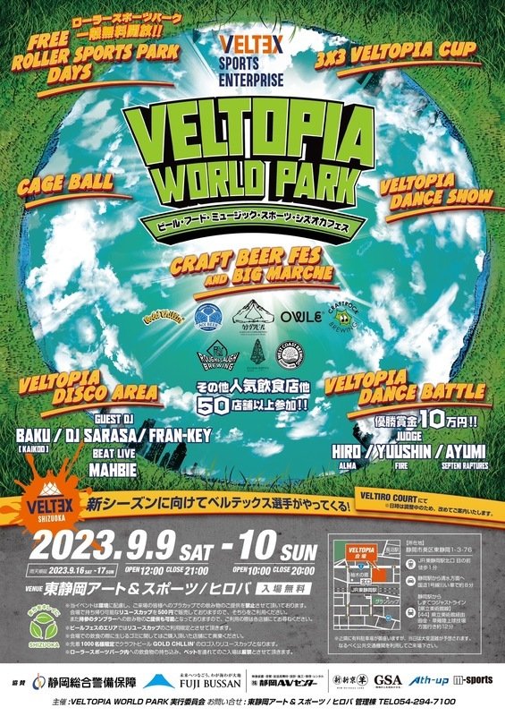 | お問い合わせ | 【主催】 VELTOPIA WORLD PARK実行委員会 【お問合せ先】 東静岡アート&スポーツ/ ヒロバ 管理棟 TEL 054-294-7100 |